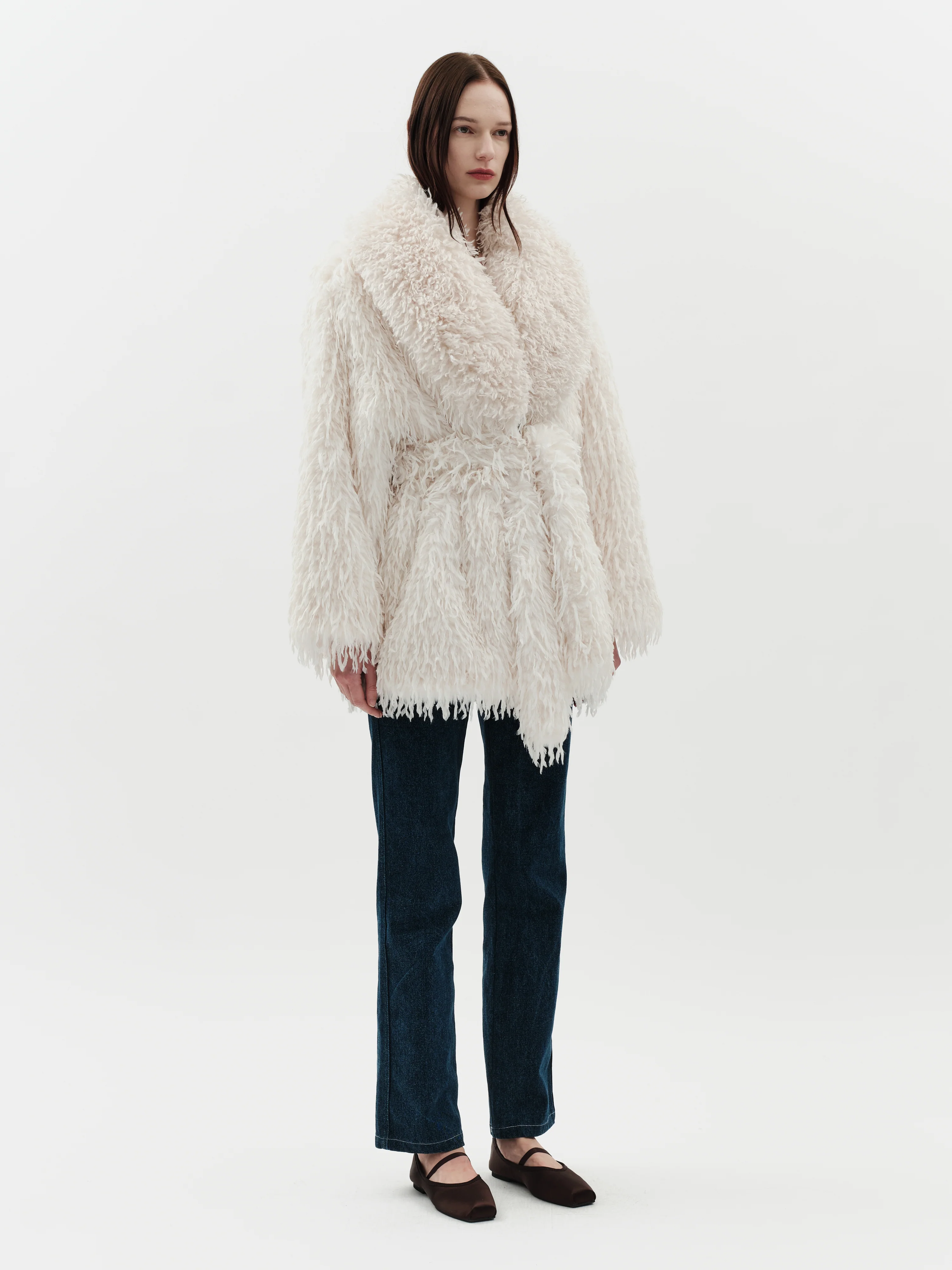 The Tavi Coat is about texture and movement, featuring an exaggerated Mongolian faux fur collar paired with a body crafted from delicate faux feathers that create a beautifully fluid silhouette.
